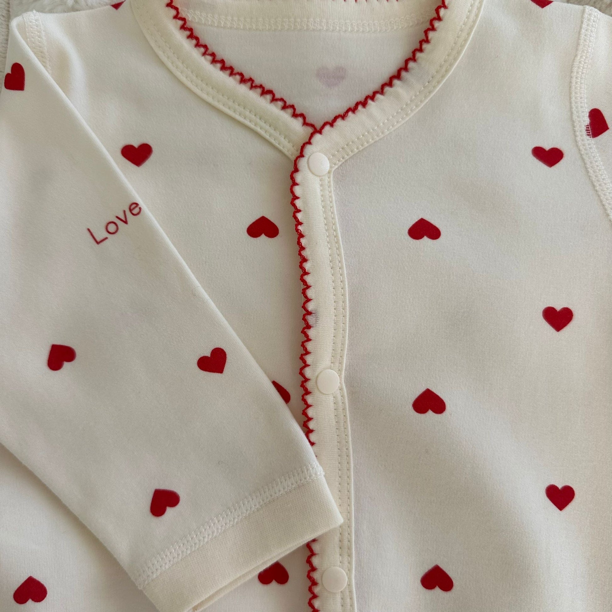 Craquez pour cette adorable barboteuse blanche parsemée de petits cœurs rouges, symbole de tendresse et d’amour.