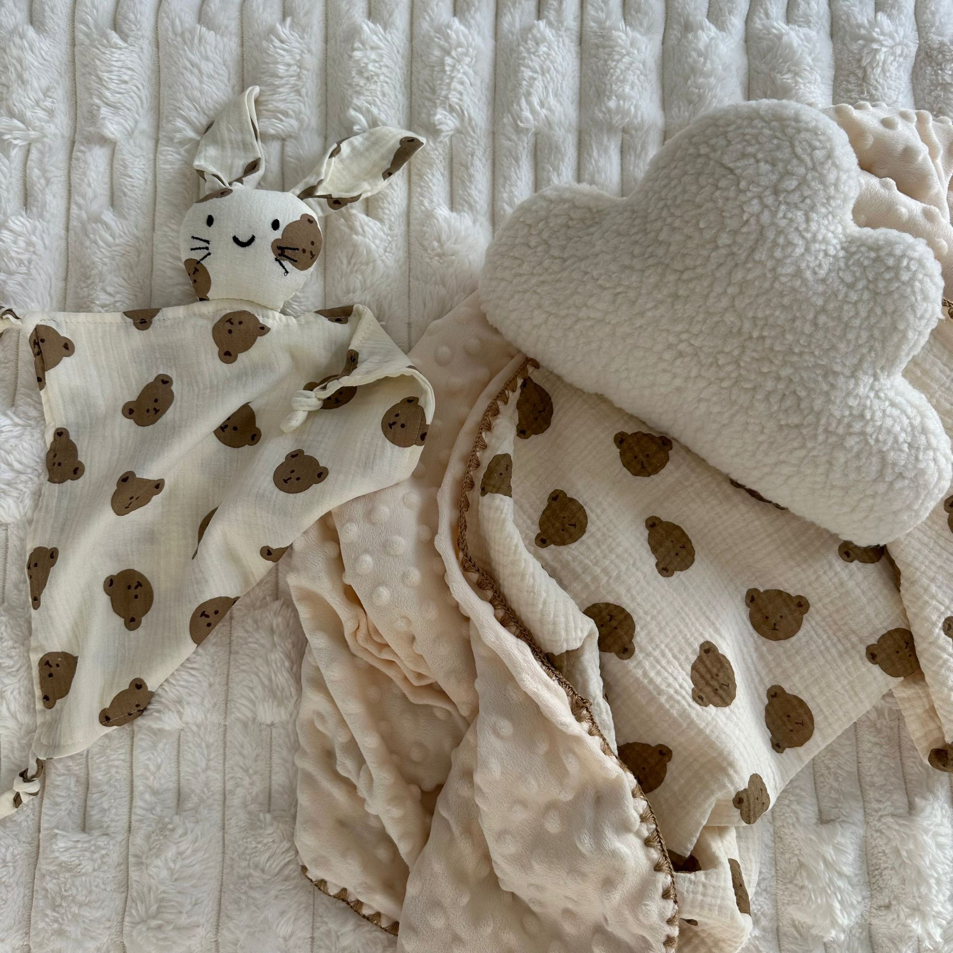 Il comprend un adorable doudou assorti à une couverture de la même collection, décorés de petits oursons et confectionnés en gaze de coton douce et légère.