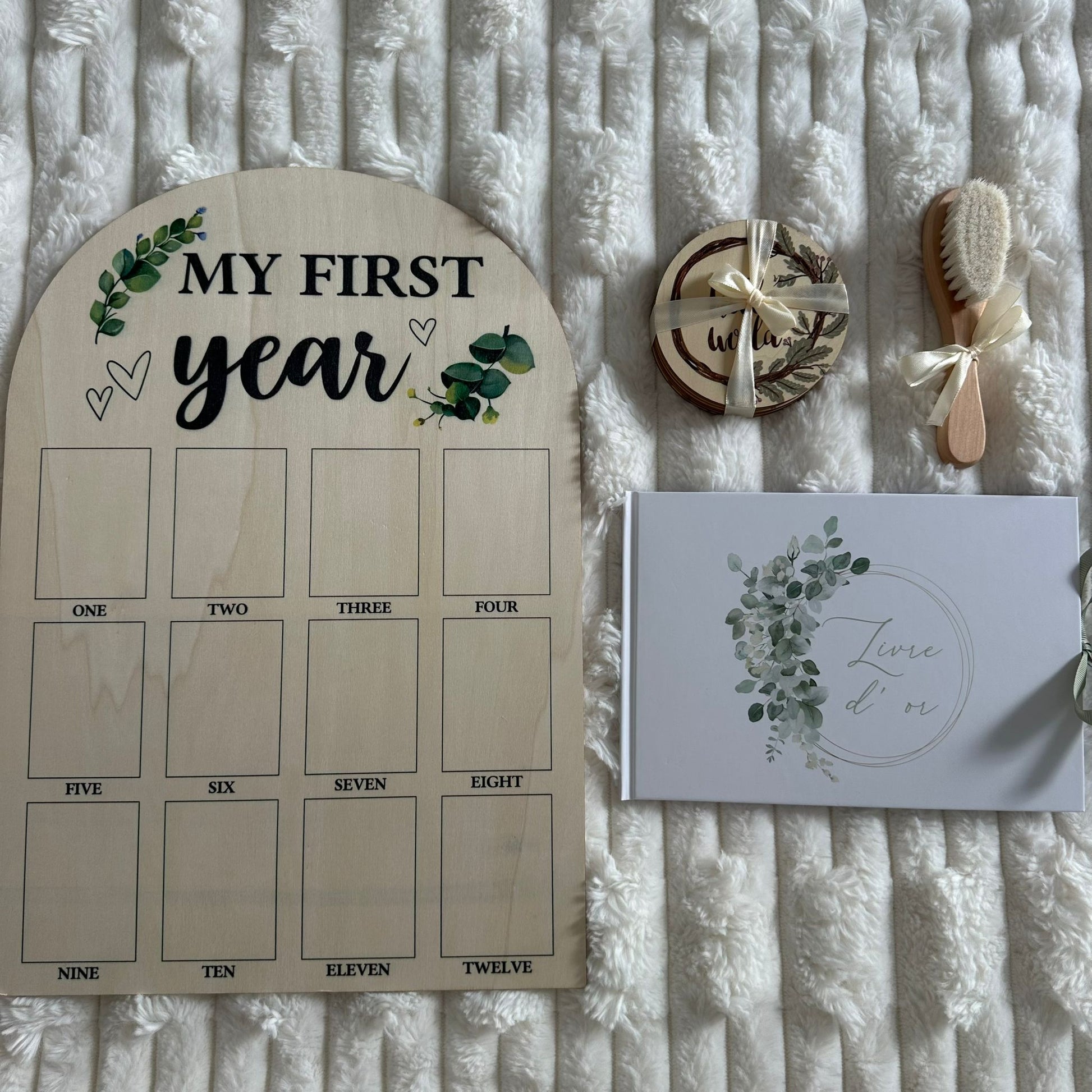 - Cadre “Ma première année – Nature Enchantée” : en bois naturel, 12 emplacements photos (1 à 12 mois), à poser ou accrocher