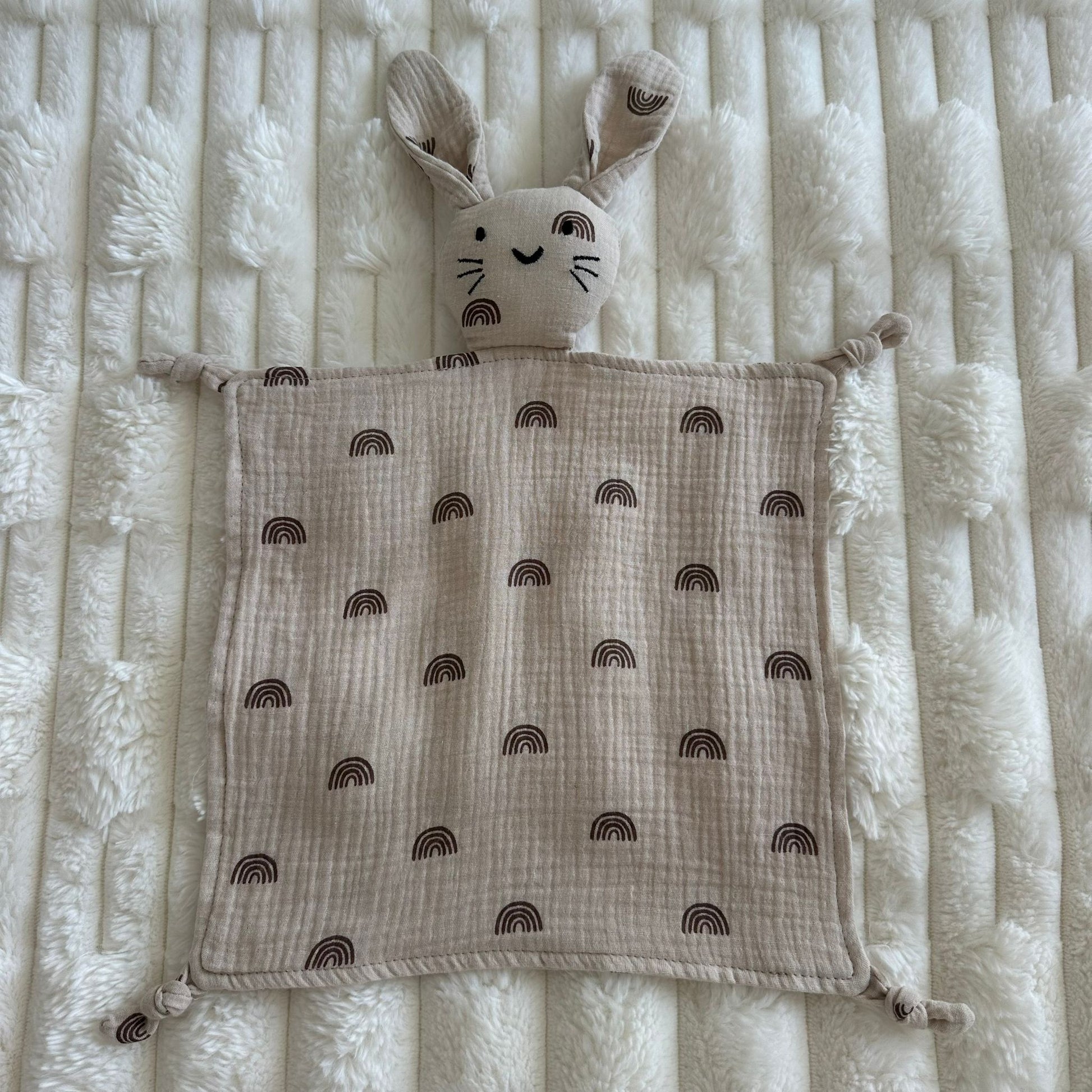 Ce doudou en gaze de coton séduit par ses jolis motifs d’arcs délicats et son esprit naturel. Sa matière douce et respirante en fait un compagnon idéal pour rassurer bébé au quotidien, lors des siestes comme des moments câlins.