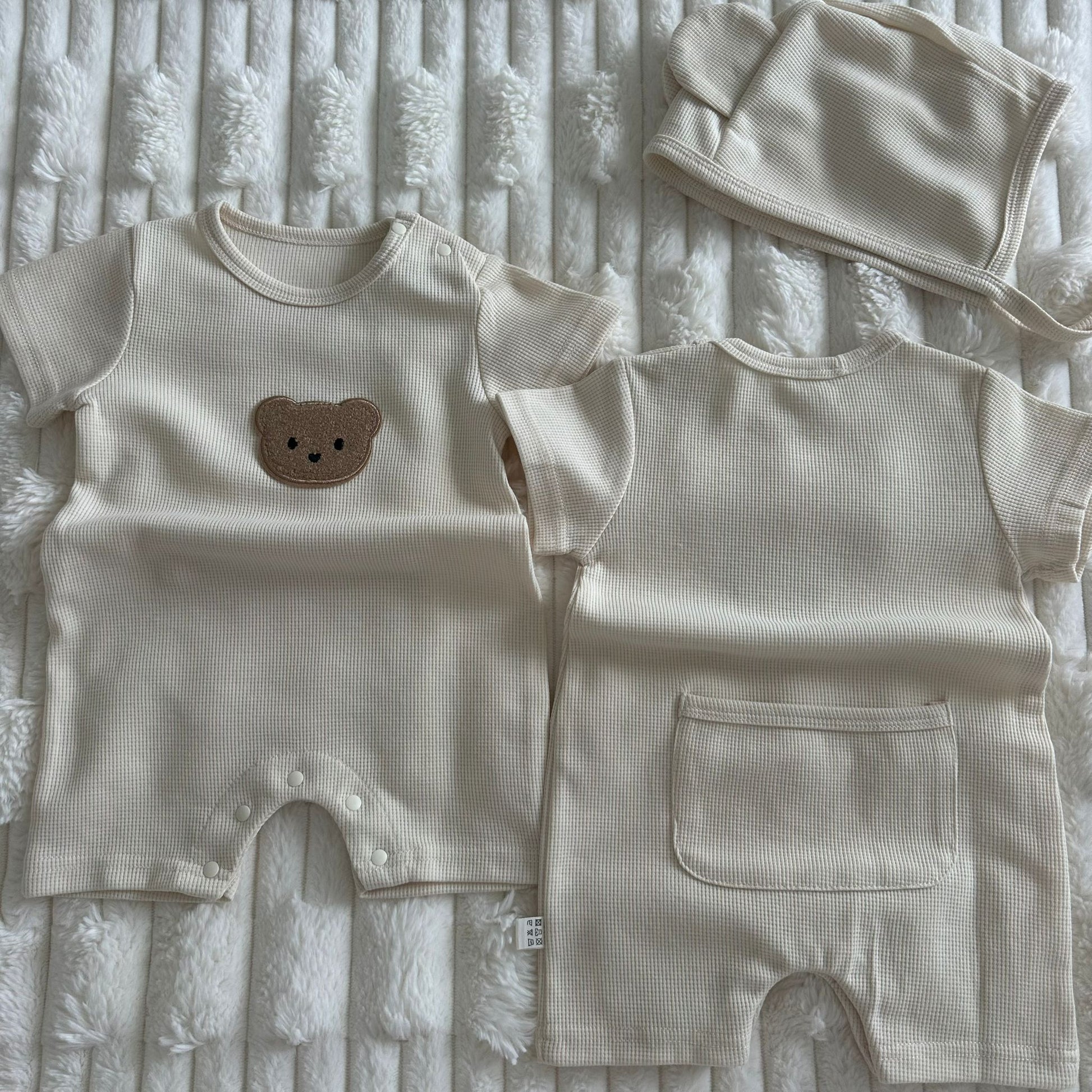 L’ensemble comprend deux pièces : une barboteuse courte à pressions et un bonnet assorti avec oreilles d’ourson.